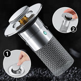 Wir präsentieren unseren Edelstahl-Bodenablauffilter und Waschbeckenverschluss. Entwickelt, um Ihre Abflüsse frei von Verstopfungen und Gerüchen zu halten, fungiert dieser aufspringende Waschbeckenverschluss auch als Haarfänger und Duschabfluss-Sieb. Mit dieser effizienten und langlebigen Lösung für Ihr Badezimmer sagen Sie Verstopfungen und unangenehmen Gerüchen Lebewohl.