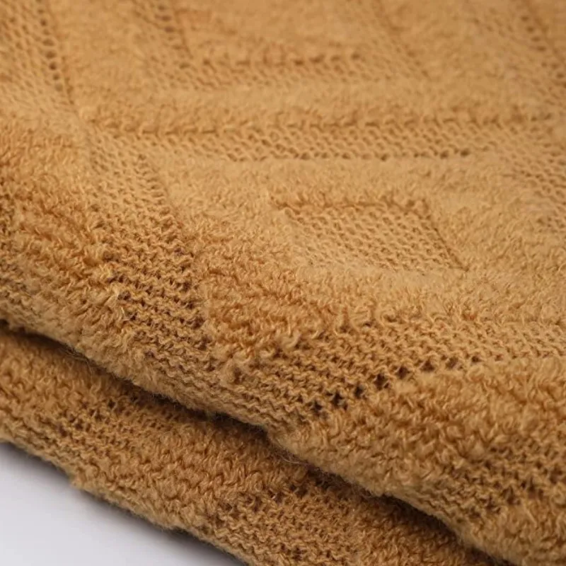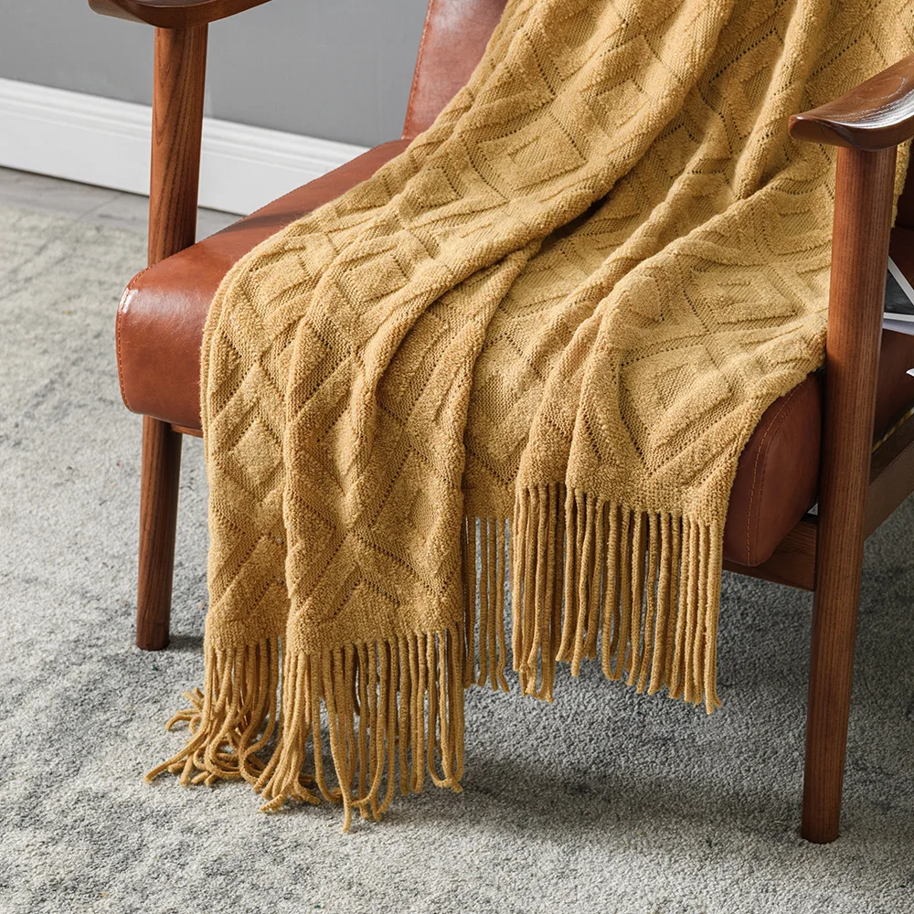 Luxuriöses Design: Das strukturierte Strickmuster und die stilvollen Fransen machen diese Decke zu einem echten Blickfang – perfekt, um Wohnzimmer, Schlafzimmer oder Leseecke aufzuwerten.