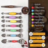 Das Set umfasst 8 Messgrößen von 1/16 TL bis 1 EL, inklusive eines Nivellierers für präzises Abmessen.