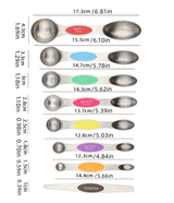 Größen: 1 EL (15 ml), 1/2 EL (7,5 ml), 1 TL (5 ml), 3/4 TL (3,75 ml), 1/2 TL (2,5 ml), 1/4 TL (1,25 ml), 1/8 TL (0,62 ml), 1/16 TL (0,33 ml) + 1x Nivellierer