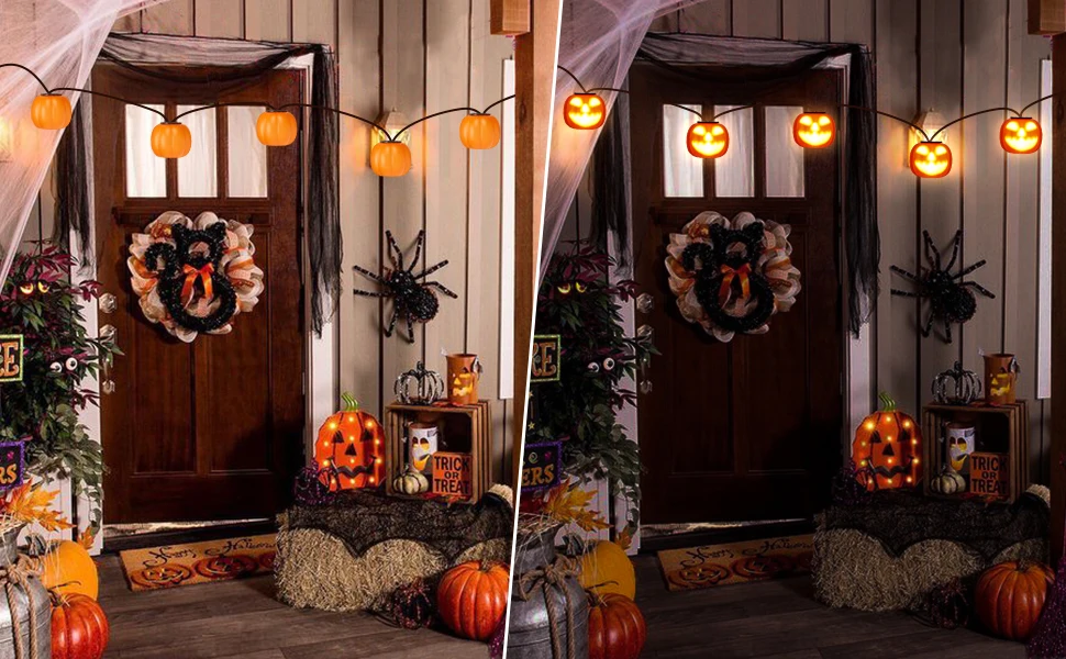 Mache dein Halloween unvergesslich – mit der PumpkinPhantasm Lichterkette! Auf 4,5 Metern Länge strahlen 8 realistische Kürbislampen, die nicht nur flackern, sondern auch mit eingebauten Projektionen und schaurigen Soundeffekten für Gänsehaut sorgen. Perfekt für Kinder, die beim „Süßes oder Saures“ erschreckt werden sollen, oder als Highlight jeder Halloween-Party.