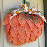Der Kürbiskörper besteht aus Poly-Burlap-Mesh in Orange. Der Kürbisstiel ist aus olivgrünem Poly-Burlap-Mesh. Beerendekorationen und eine hübsche Schleife, verziert mit Kürbissen, runden das Design ab.