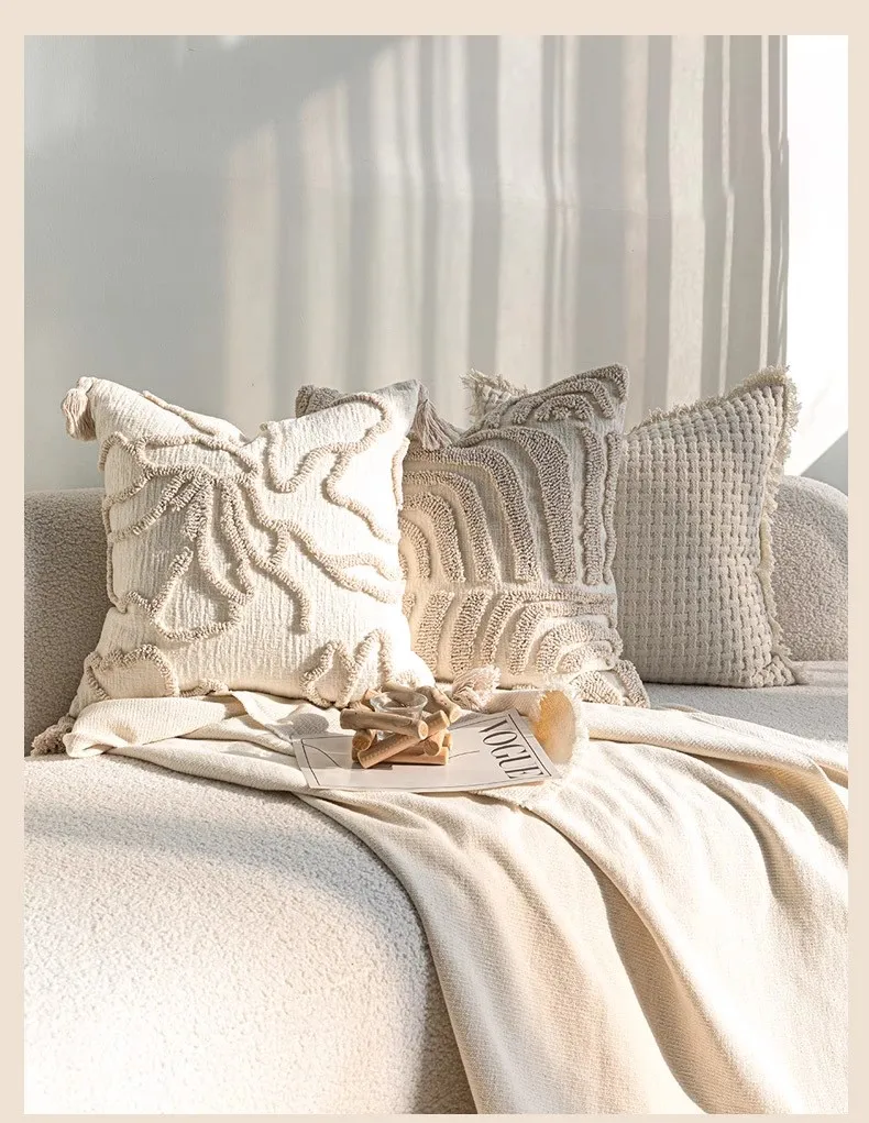 📌 Struktur trifft Stil: Die aufwendig gewebten 3D-Muster verleihen den Bezügen eine natürliche Tiefe – perfekt für moderne, skandinavische und Boho-Interieurs.